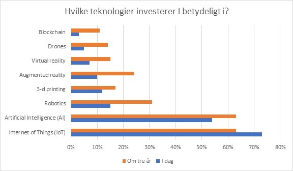 Rapporten viser, at ledere forventer, at Internet of Things (IoT) og Artificial Intelligence (AI) kommer til at skabe de største forandringer. Og det er også her de især investerer. 73 % siger, de investerer i IoT og 54 % at de investerer i AI. Se nedenstående grafik.